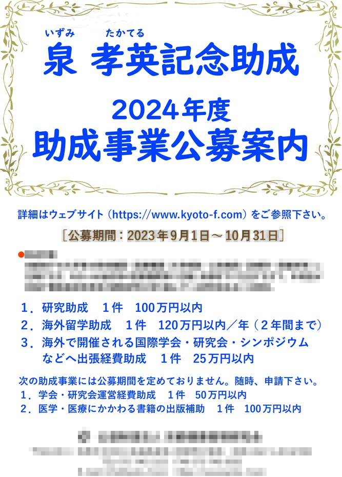 泉 孝英記念助成 2024年度助成事業公募案内[公募期間:2023年9月1日~10月31日]
